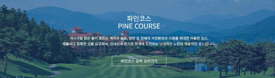 파인힐스 CC 코스는 27홀로 되어 있으며, 파인코스 / 레이크코스 / 힐스코스로 되어 있습니다.