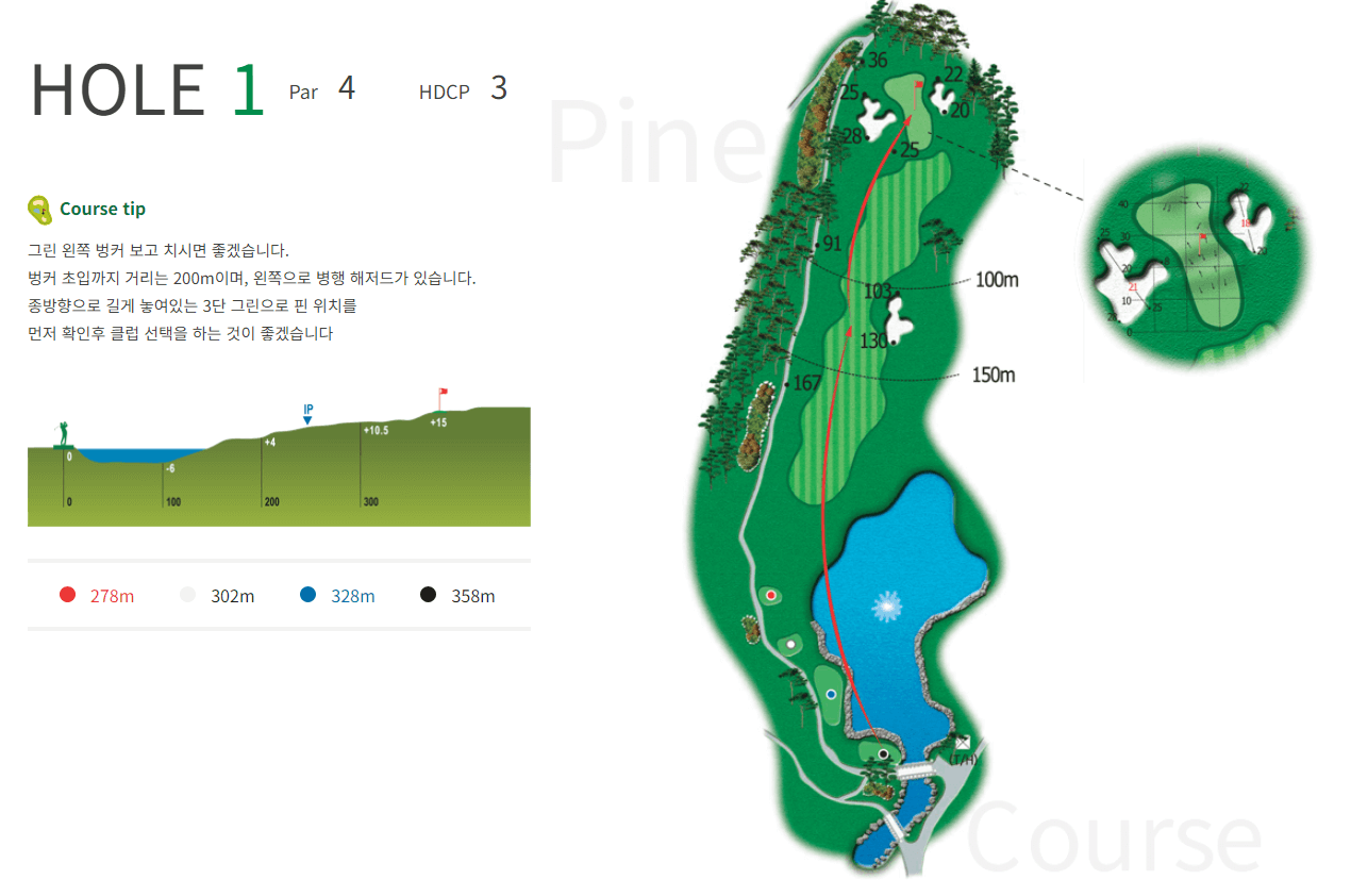 파인코스의 공략은 그린 왼쪽 병커를 보고 치시면 좋습니다.